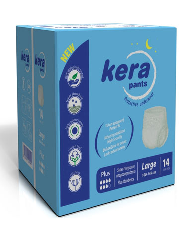 Τα kera Pants Plus είναι απαλά προστατευτικά εσώρουχα μίας χρήσης με άνετη εφαρμογή. Με μια σειρά από καινοτόμα χαρακτηριστικά, προσφέρουν προστασία από τις διαρροές, τις οσμές και την υγρασία.